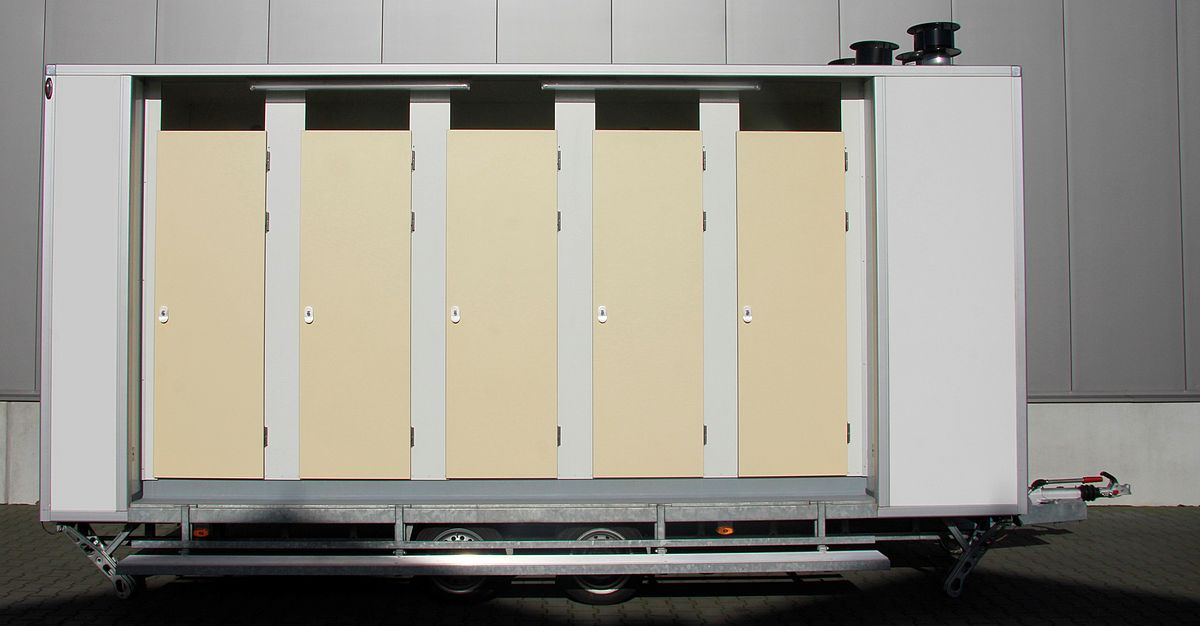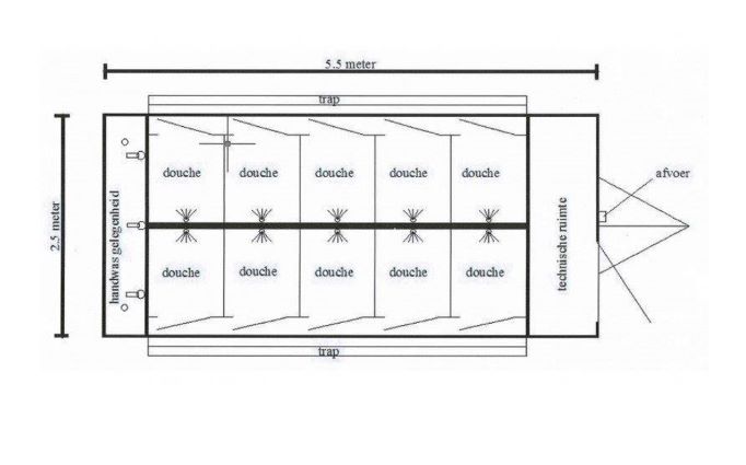 Een grote douchewagen met tien douches en een wastafel met drie kranen. De wagen beschikt over elektrische verwarming en wordt door mechanische ventilatie geventileerd. Warm water wordt verkregen door badgeisers op propaangas. De wagen beschikt over een buffertank van 500 liter.