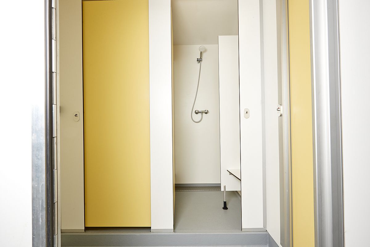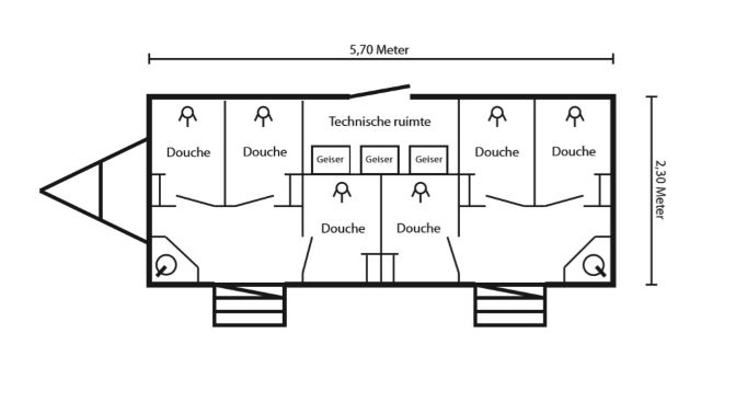 Een douchewagen met zes douches, verdeeld over twee ruimtes met drie douchecabines. Deze wagen beschikt over elektrische verwarming en wordt door middel van mechanische ventilatie geventileerd. Warm water wordt verkregen door badgeisers op propaangas. De wagen beschikt over een buffertank van 300 liter.